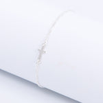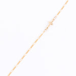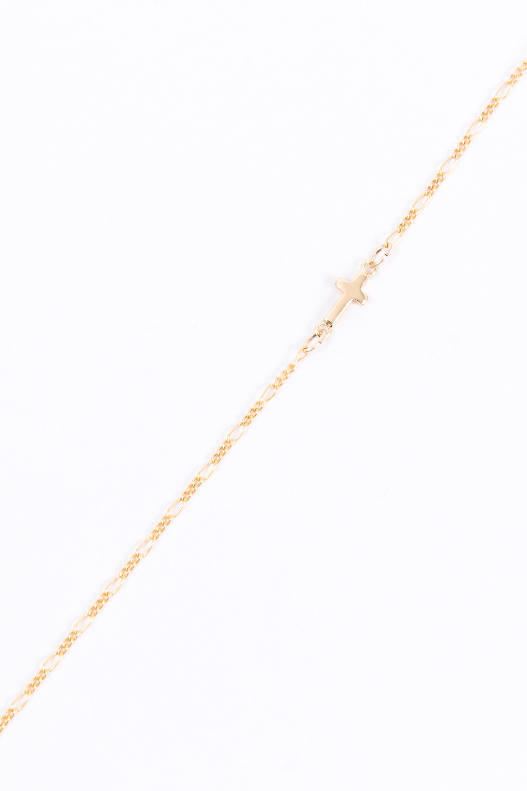 • The cross charm is offset and connected on both ends to the chain. The cross is set 2 inches in from the clasp.