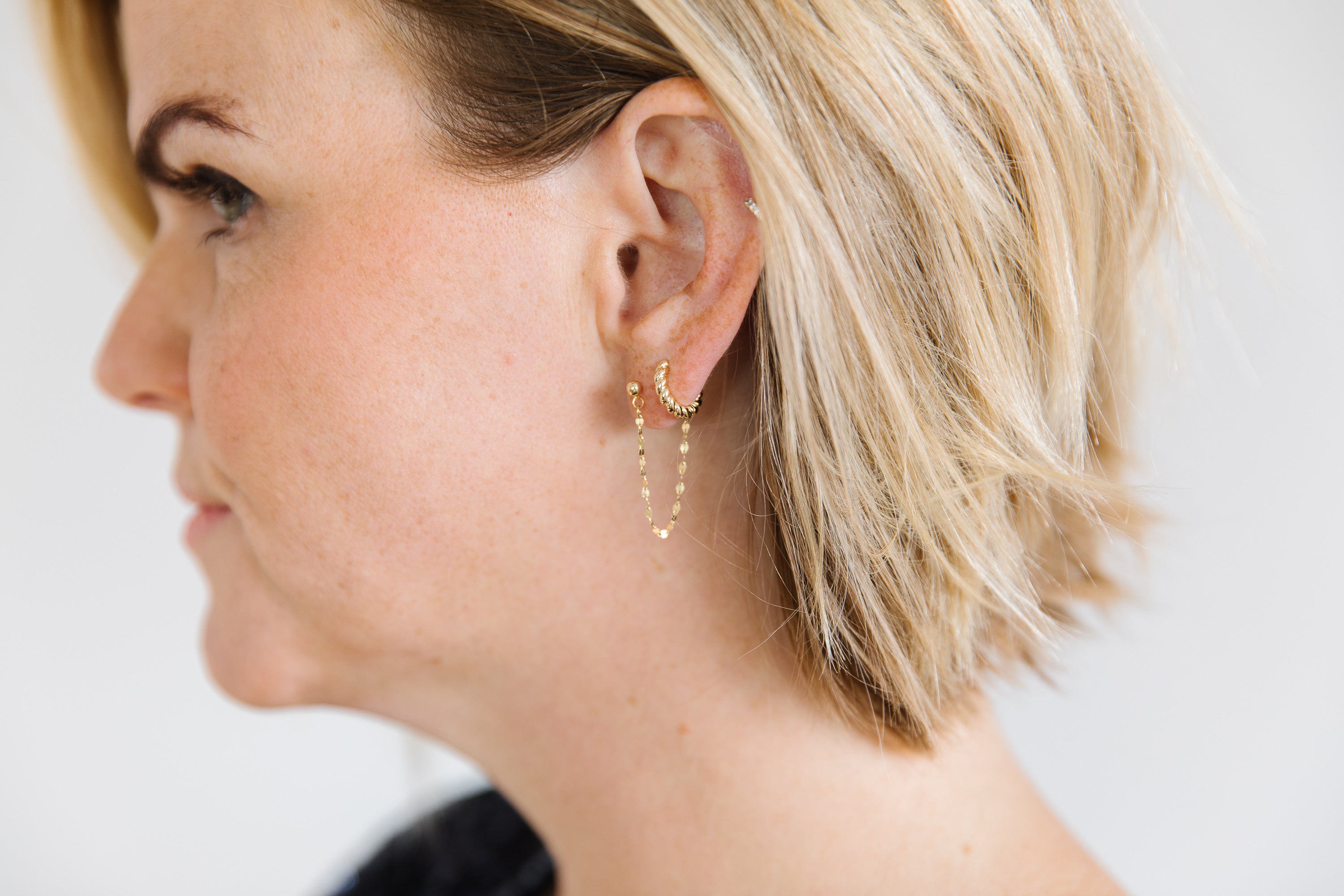 • Stud post goes through the piercing and chain connects in the back