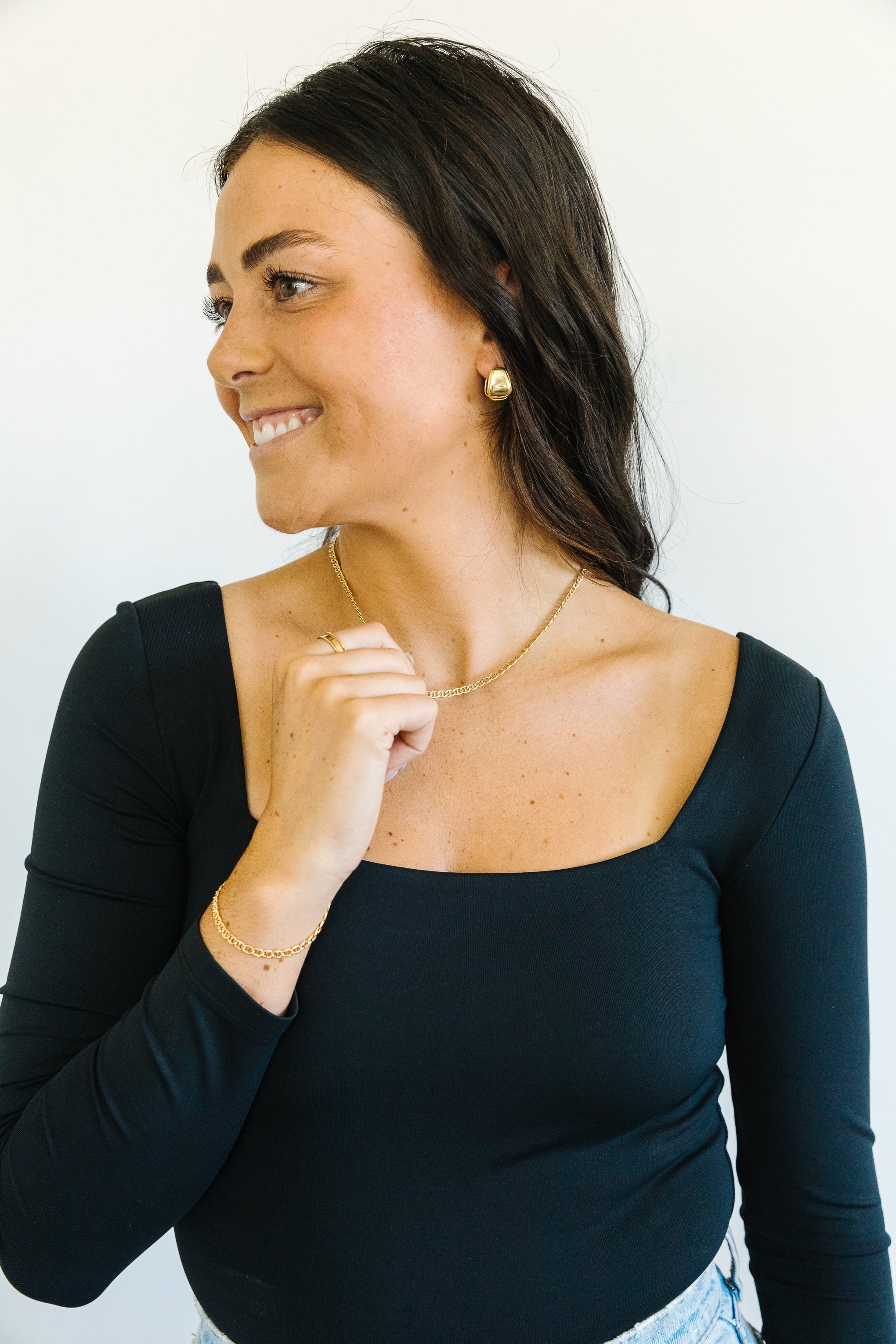 • Model is also wearing Mother of Pearl Huggie, Link Huggie, Little Black Square Screwback, and Lynn Bracelet