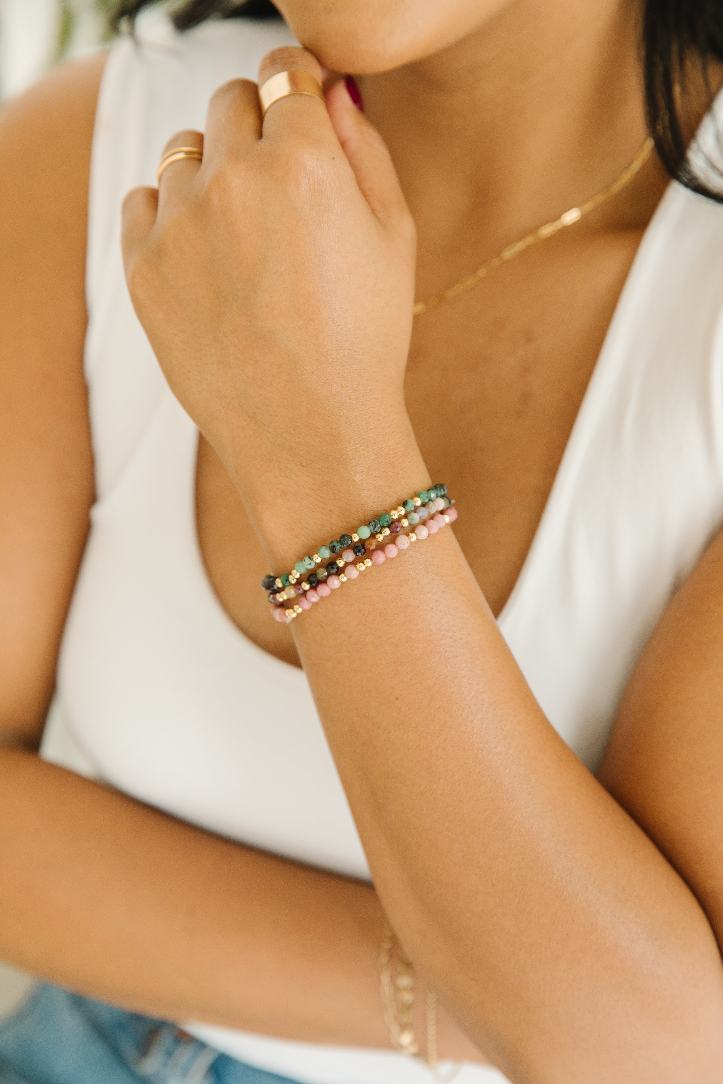 For durability, longevity, and affordability, we sell jewelry that is 14k gold-filled, vermeil, or sterling silver. Different than gold-plated, gold-filled jewelry is a layer of gold bonded through heat to a brass core. Vermeil is the same, but bonded to a a sterling silver core. These metals are durable, hypoallergenic, and tarnish resistant. Your pieces have the power to last a long time! When it comes to quality and durability, only solid gold can beat what we sell. Learn more.