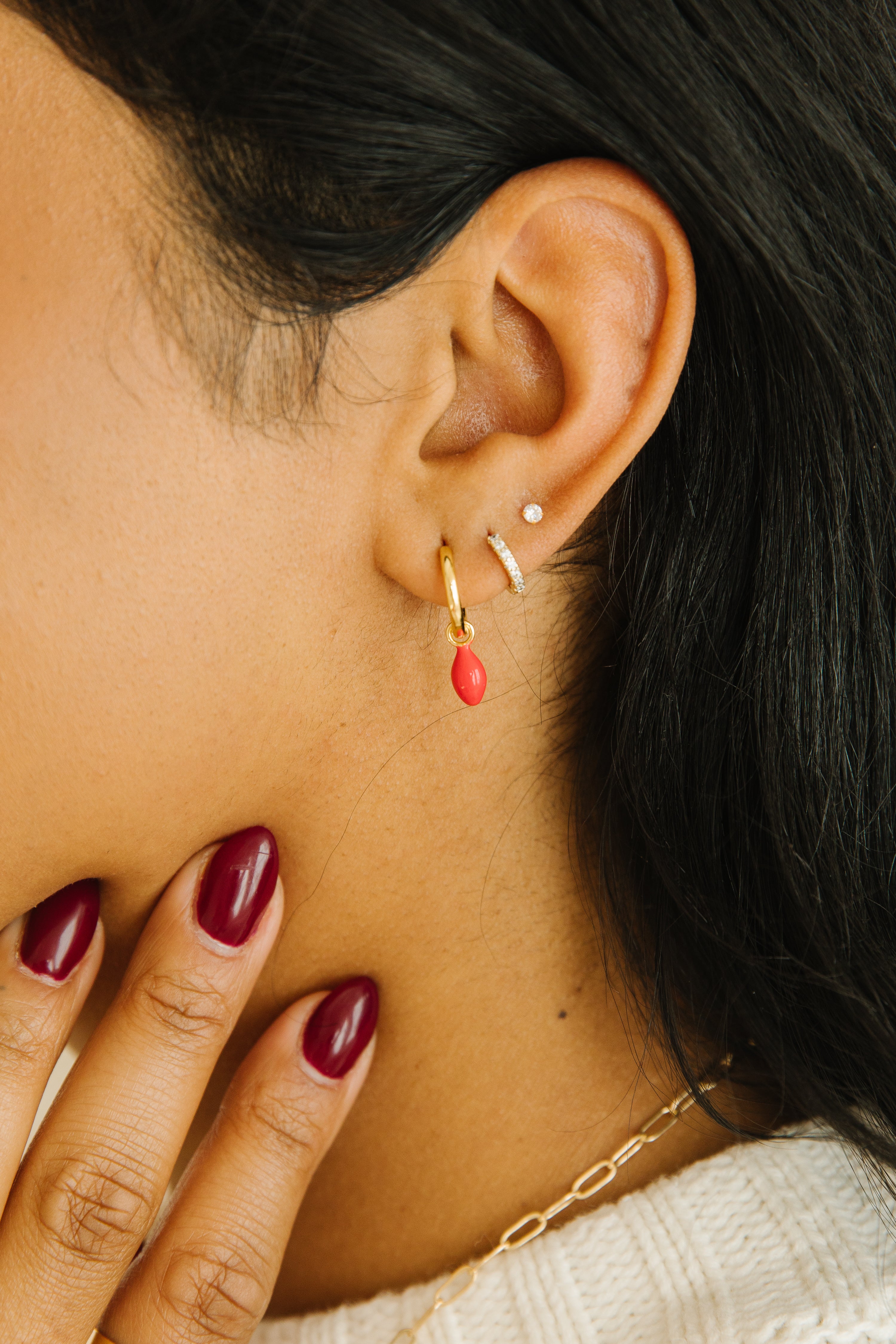 • The top ring on the charms is 2 mm in diameter.  We can not guarantee it will fit every huggie at home, and it may be a tight fit if it does fit on one of your huggies.  Please measure and ensure that the size jump ring will work if you are wanting to add charms to your own earrings at home.