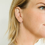 • Model is also wearing 8 mm diamond huggies, tiny hex huggies2.5 mm diamond screwbacks, coiled up bracelet.