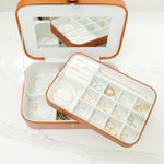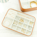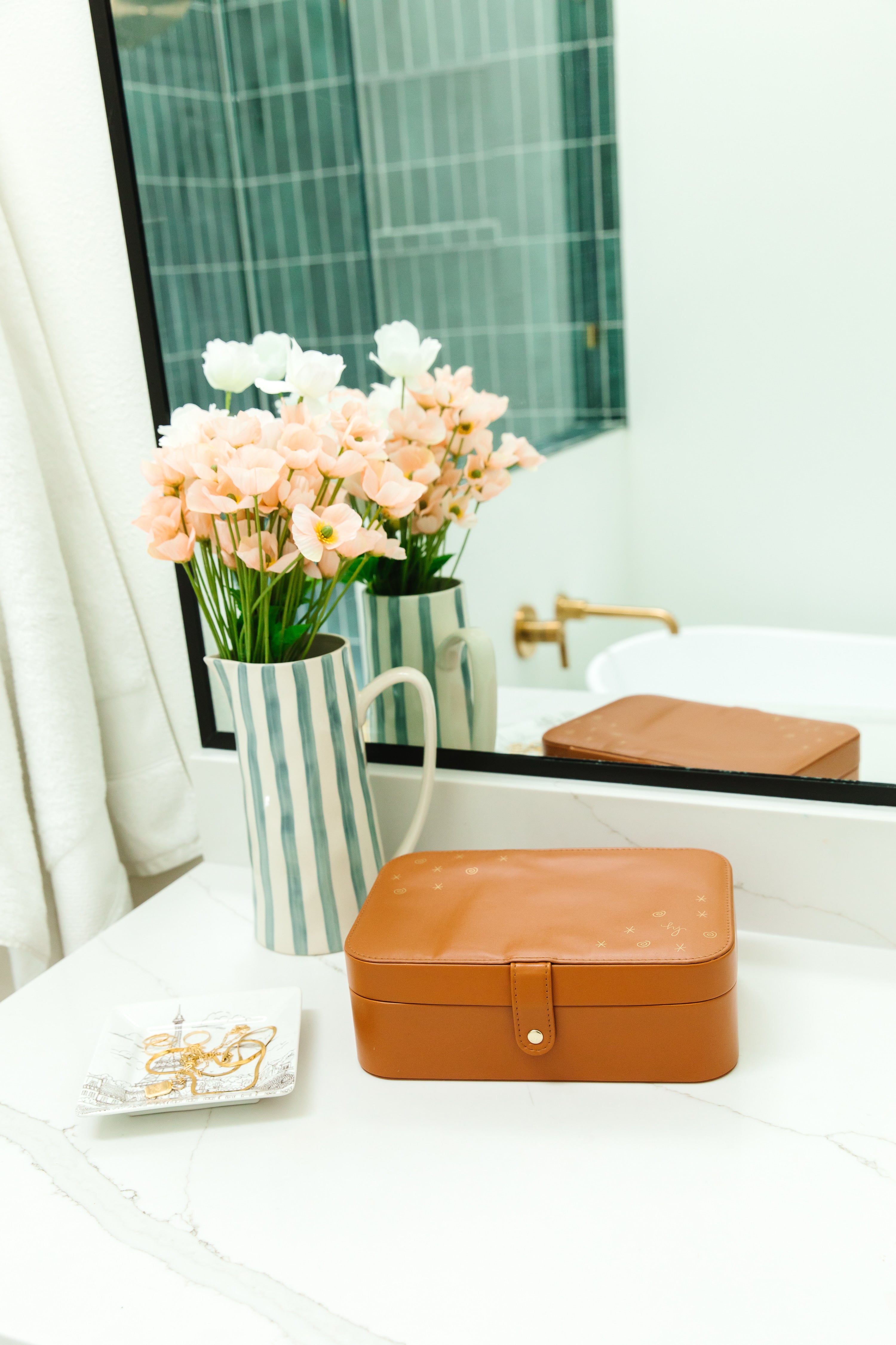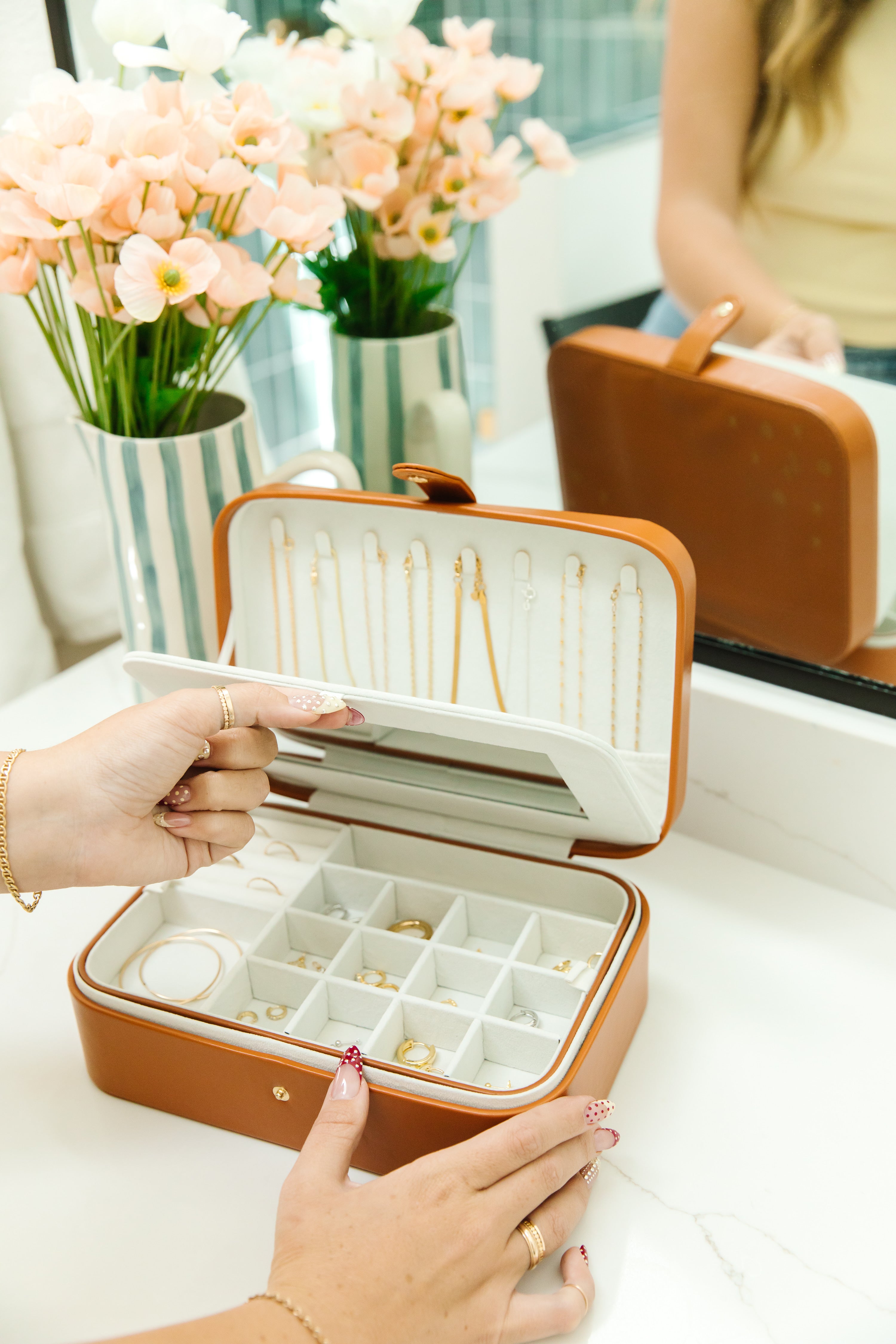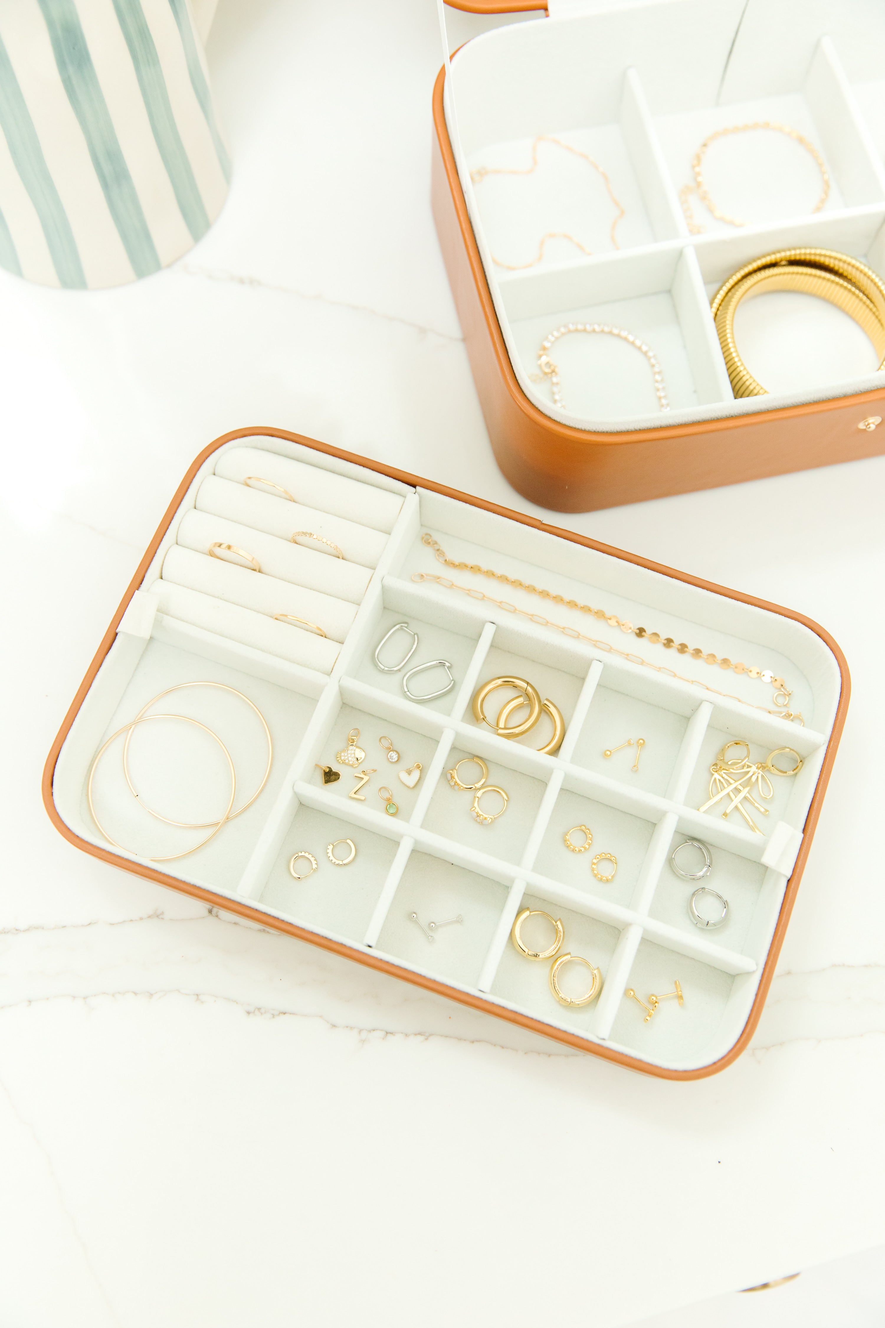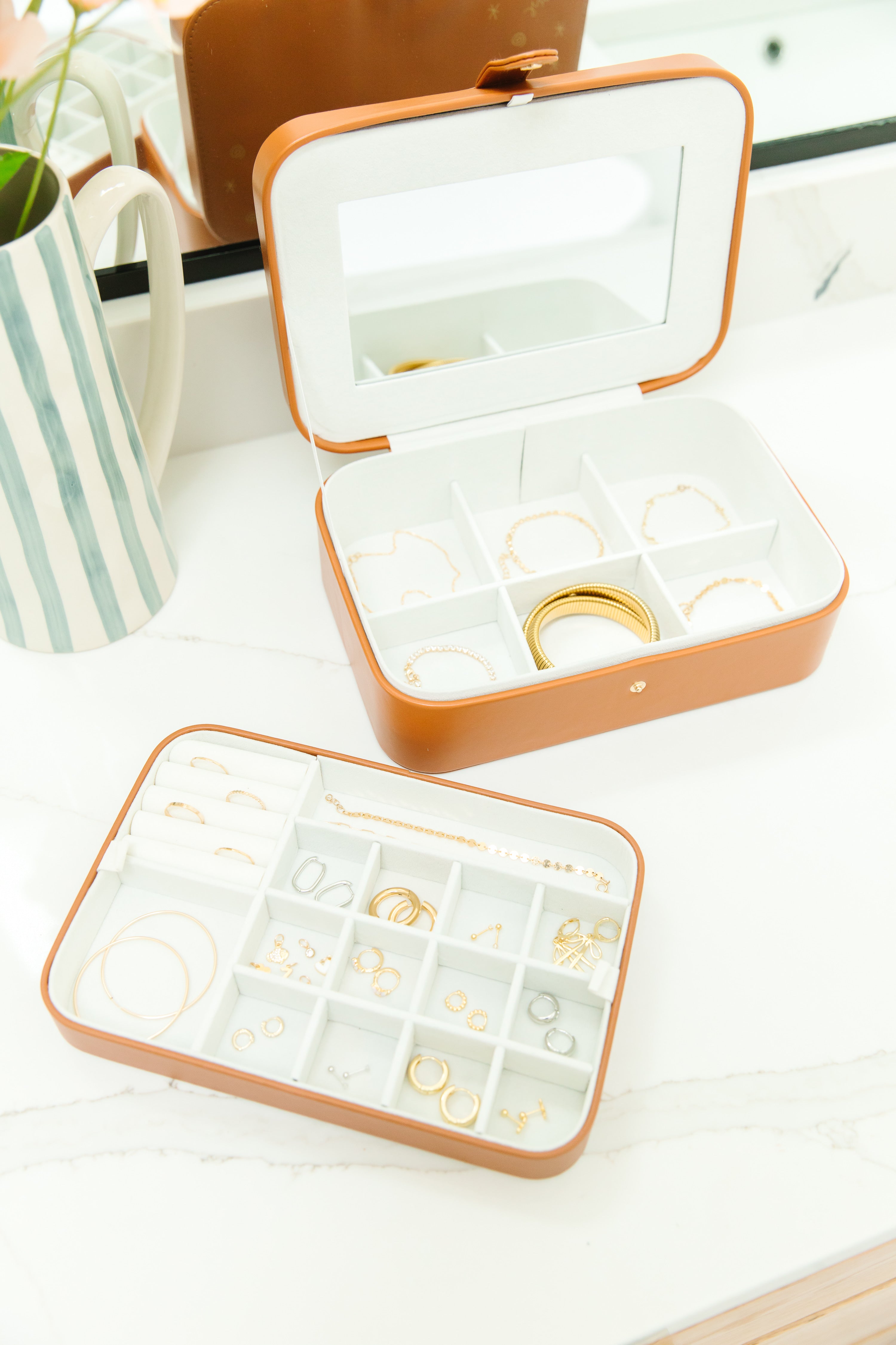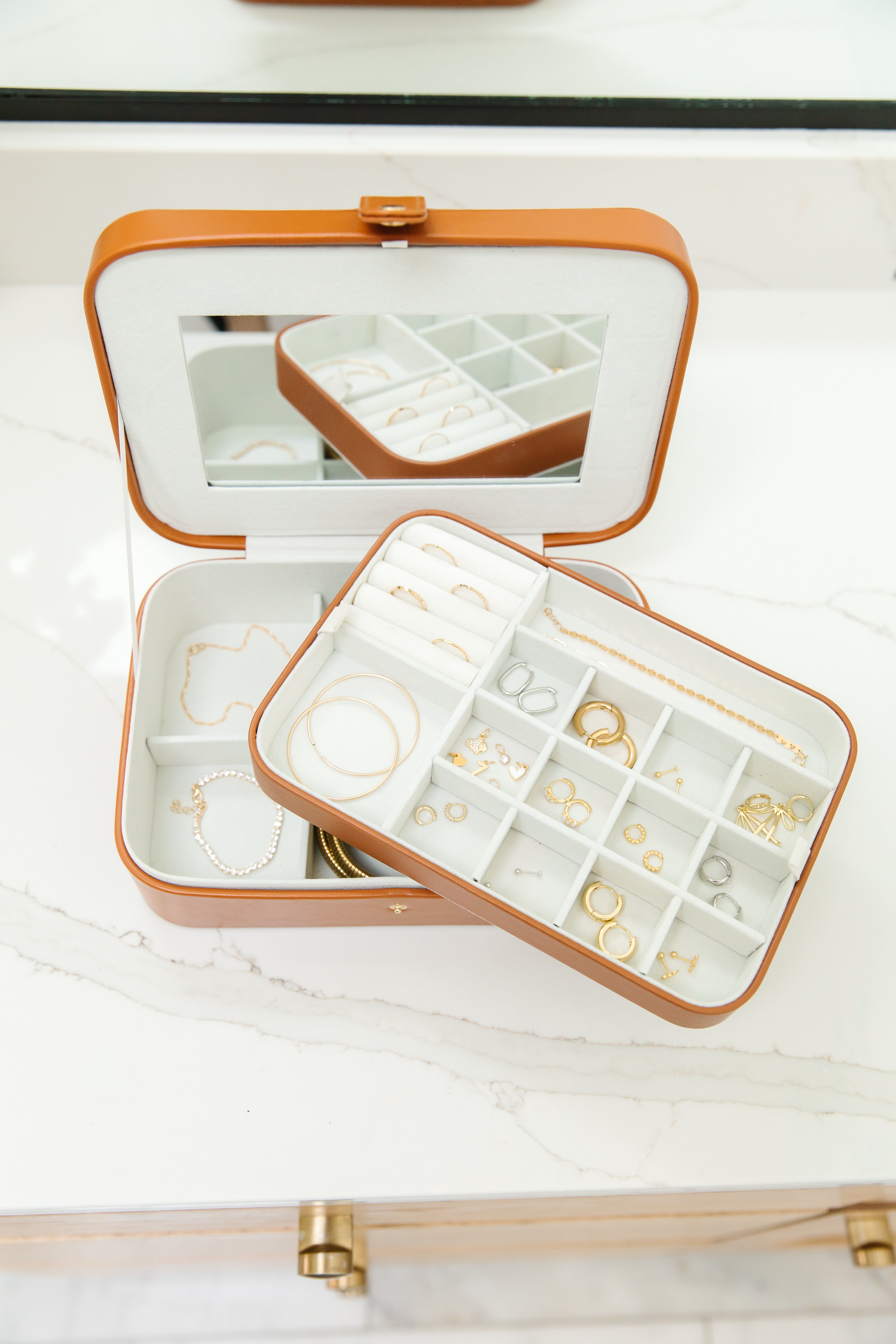 It took us a minute, but finally!  She’s arrived!  The Hey June “She’s Everything” jewelry box, made to hold everrrrrrrrrything!  With three separate compartments, an easy shelf to take in and out, and a full mirror, this gorgeous box with gold custom markings that make us squeal,  is the end all be all to your jewelry collection.  Let it hang on your nightstand, your bathroom corner, or tuck it in a drawer- this is the perfect size and look to fit wherever your busy life needs it!