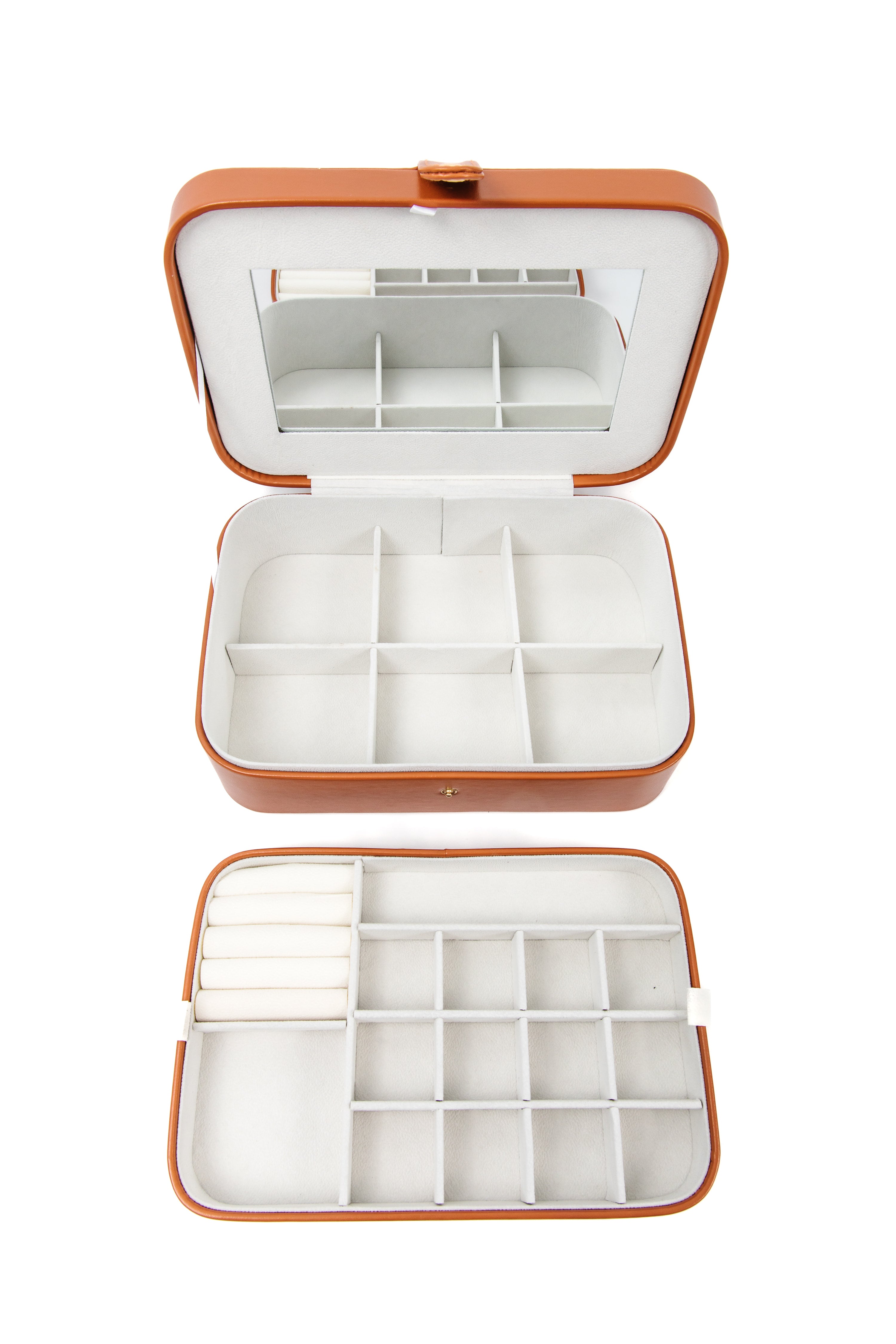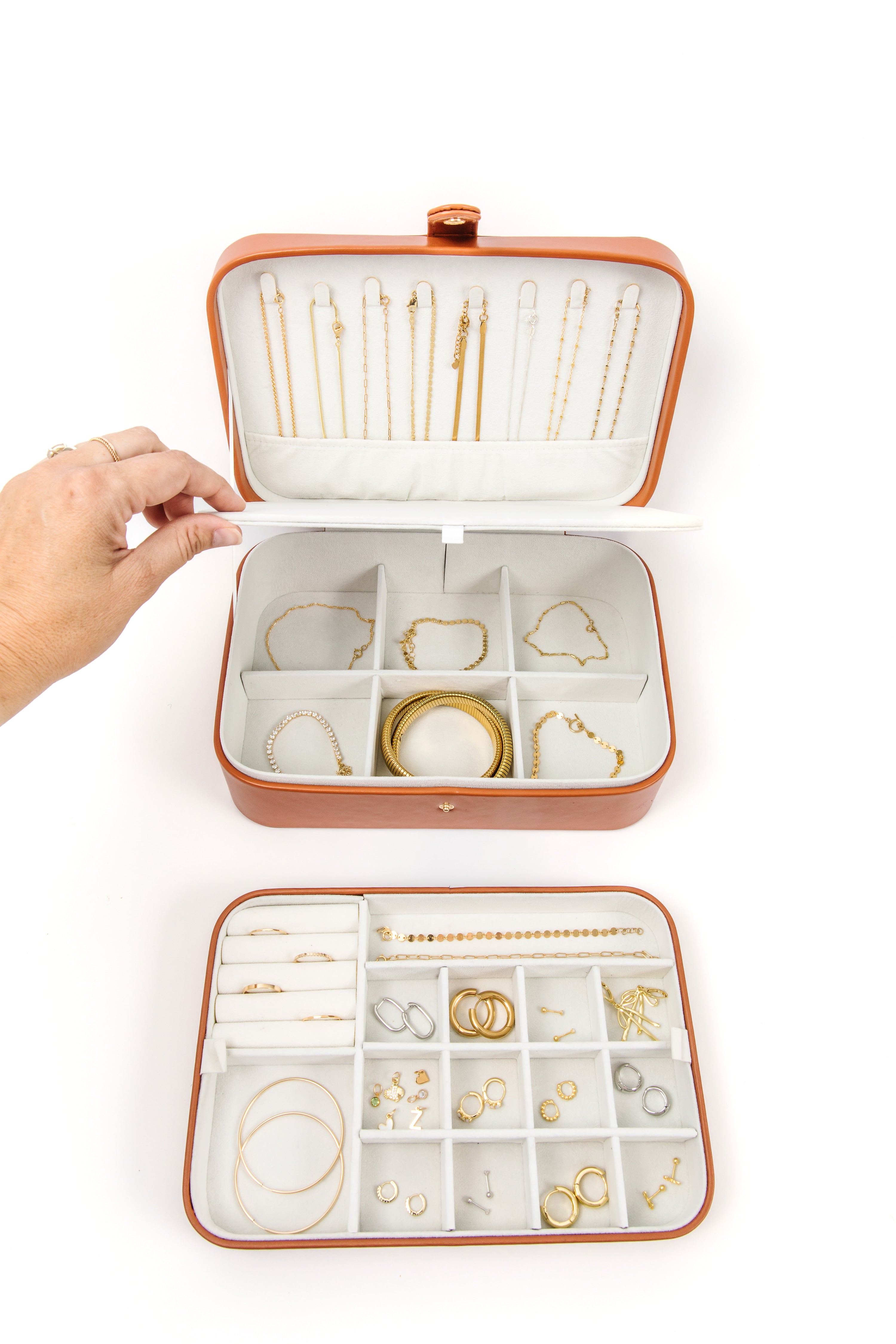 • Bottom level has nine 3 x 3 inch sections for bracelets, watches, and any large pieces that need a bit more space.