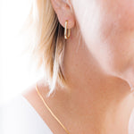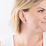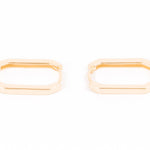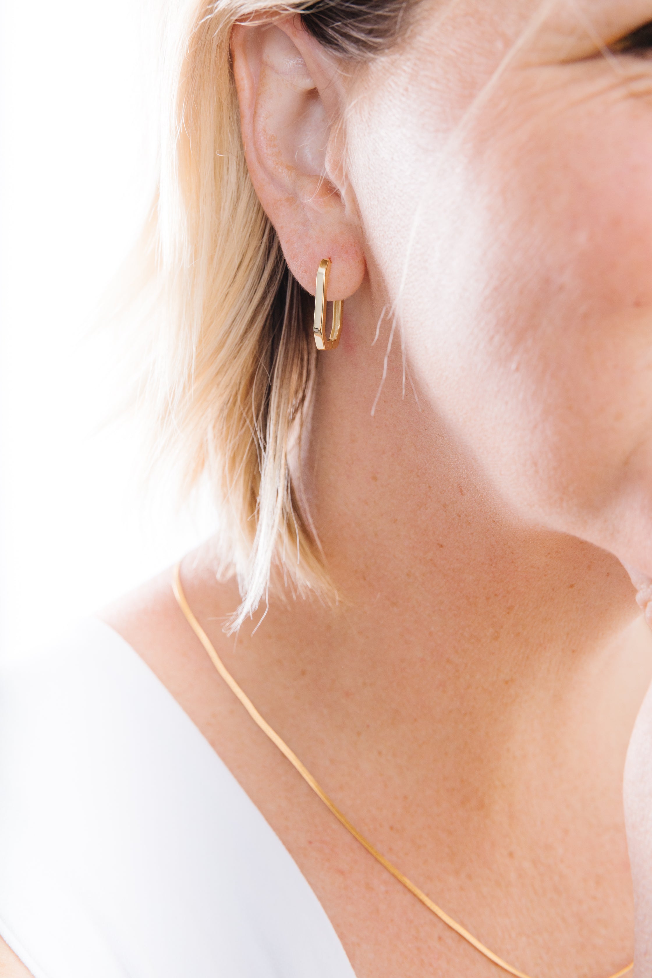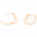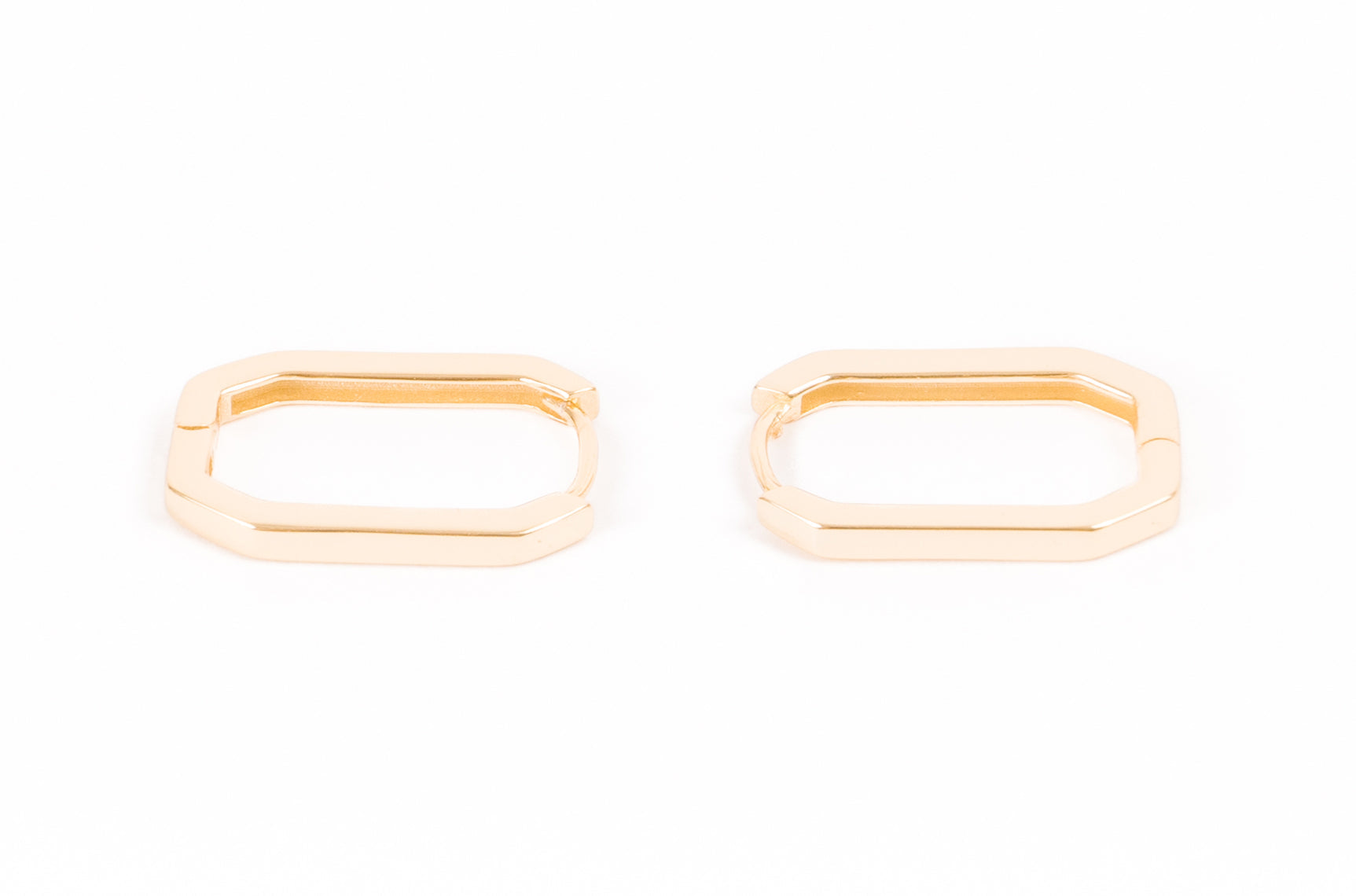 Listen ladies! We love our classic circular hoops as much as the next person, but we were ready to play with some shapes!  So we introduced hexagon huggies--AND WE LOVED THEM. You sold us out over and over again. So let's play on something that works.  Six sleek edges and an elongated edge catch the eye while somehow remaining totally chic and totally classic. Same comfortable clasp.