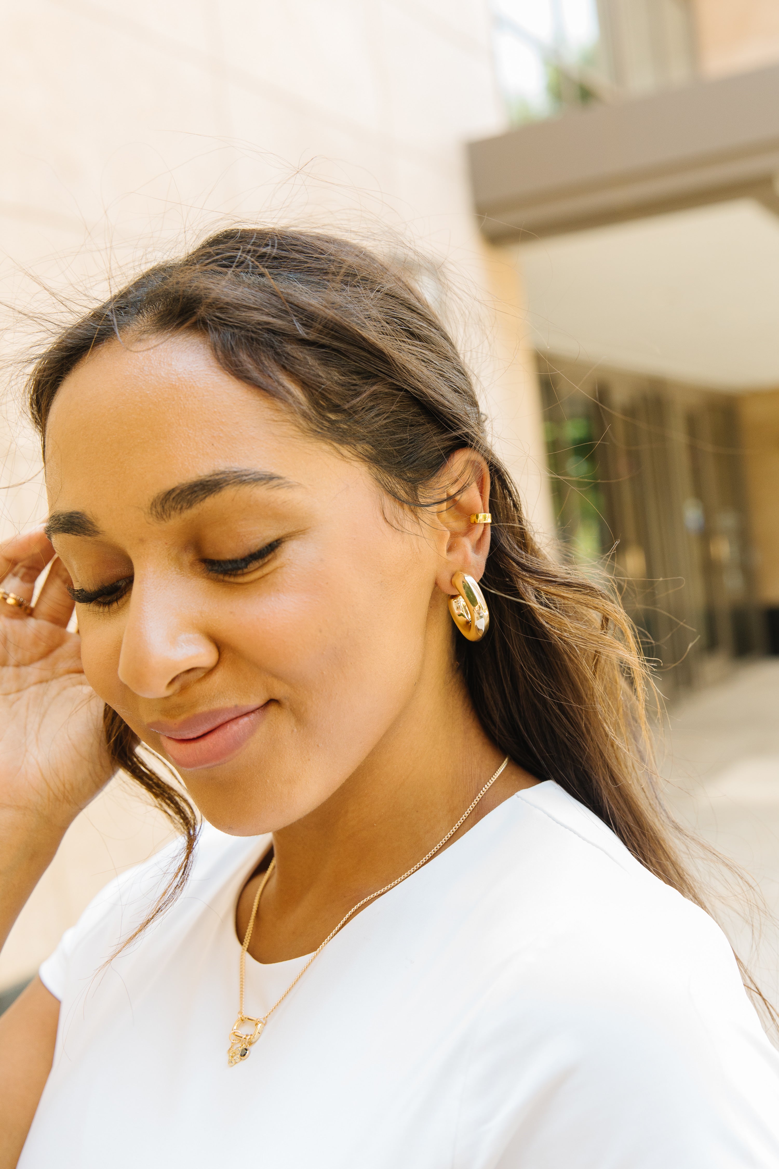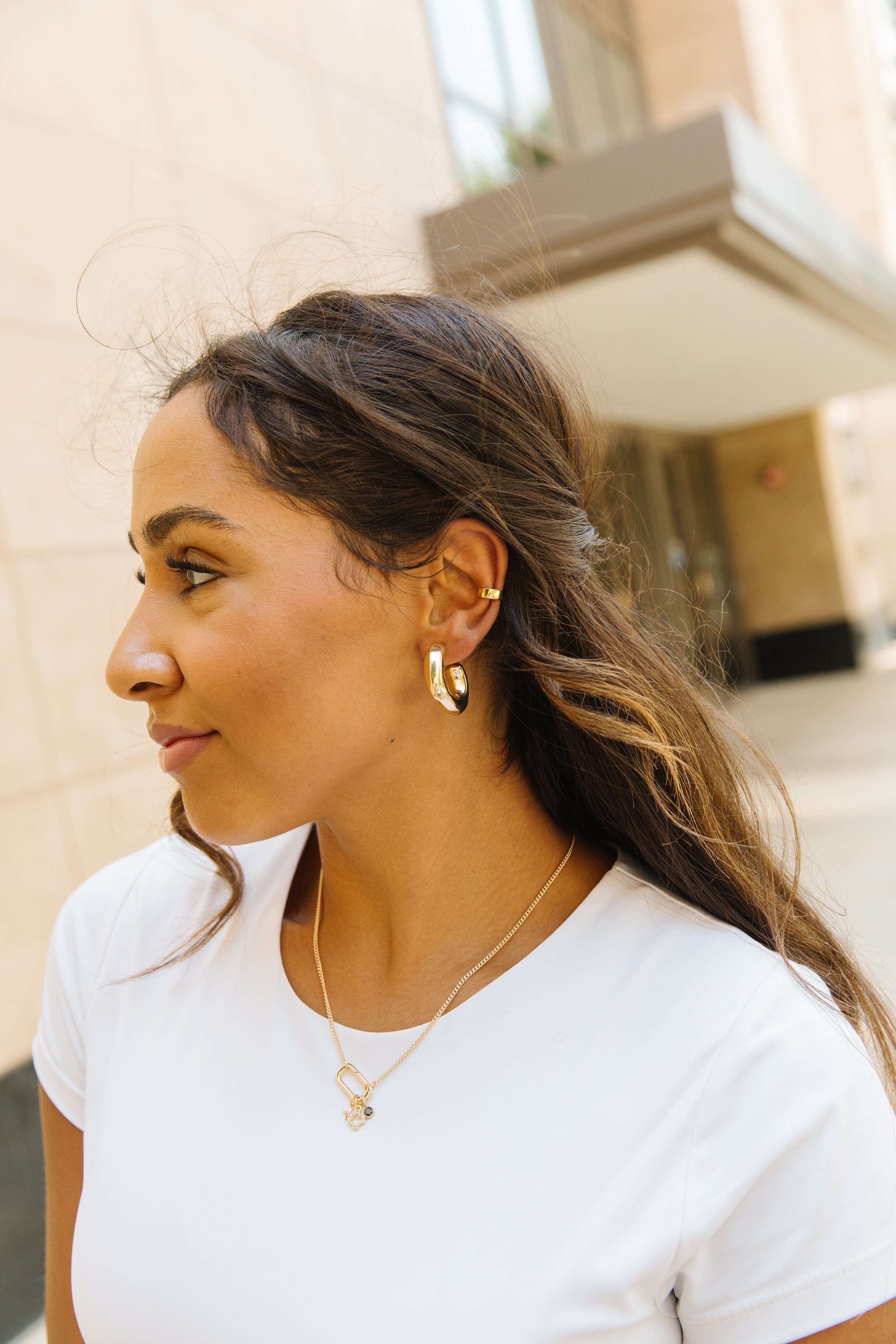 • Model is also wearing power hoops and the hooking up necklace.