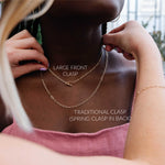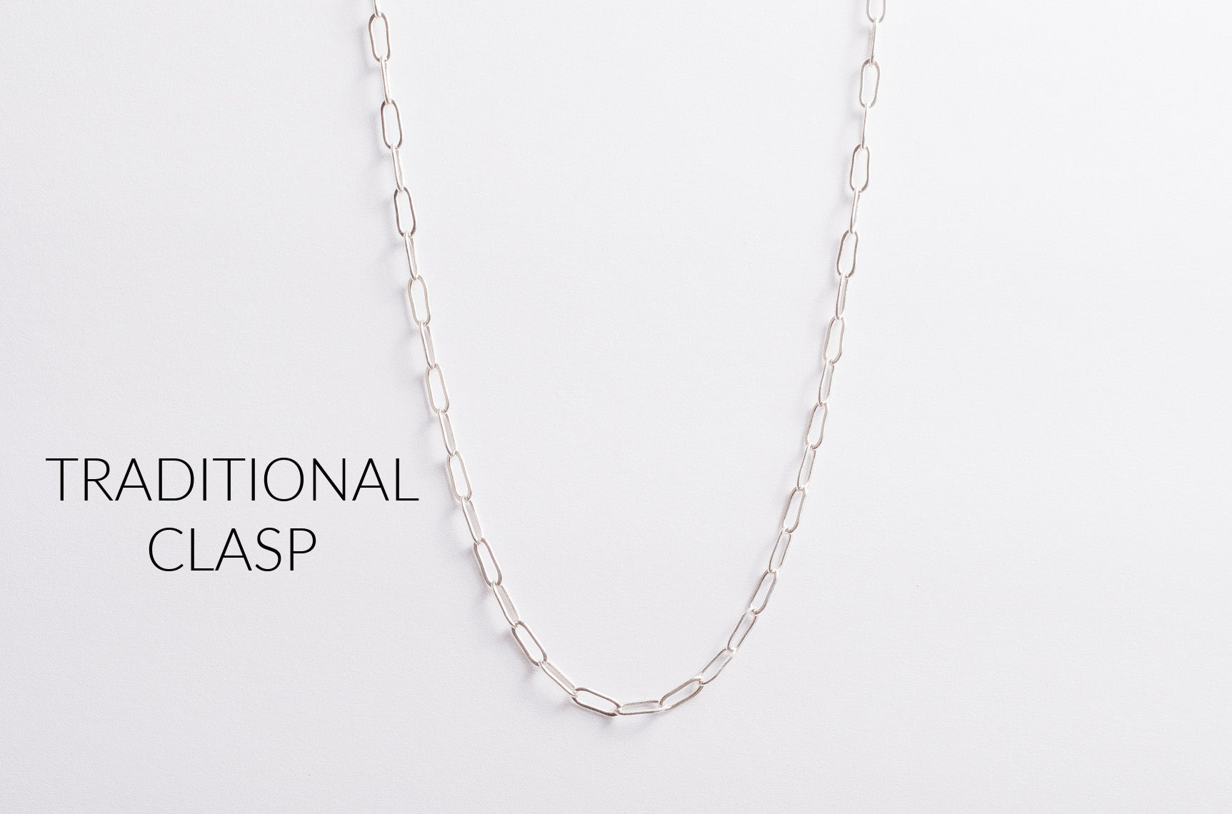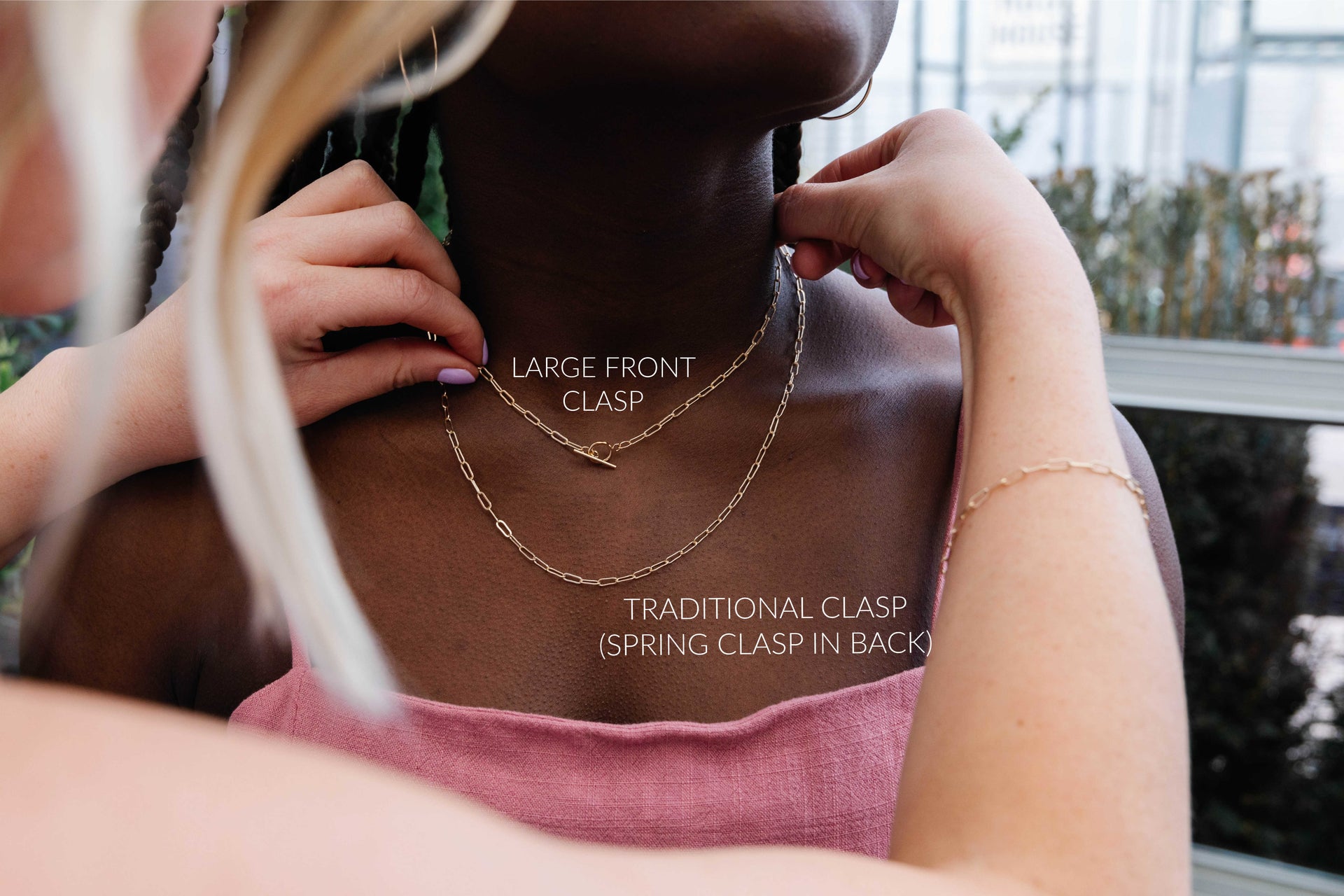 • Available with a traditional spring clasp that goes in the back, or a large front clasp.