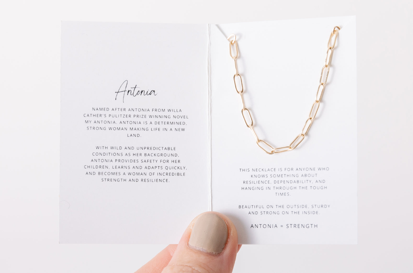 All our necklaces are named after powerful female literary characters and writers who paved the road before us. Mama Antonia is named after Antonia from Willa Cather's Pulitzer Prize winning novel My Antonia. Antonia is a determined, strong woman making life in a new land.