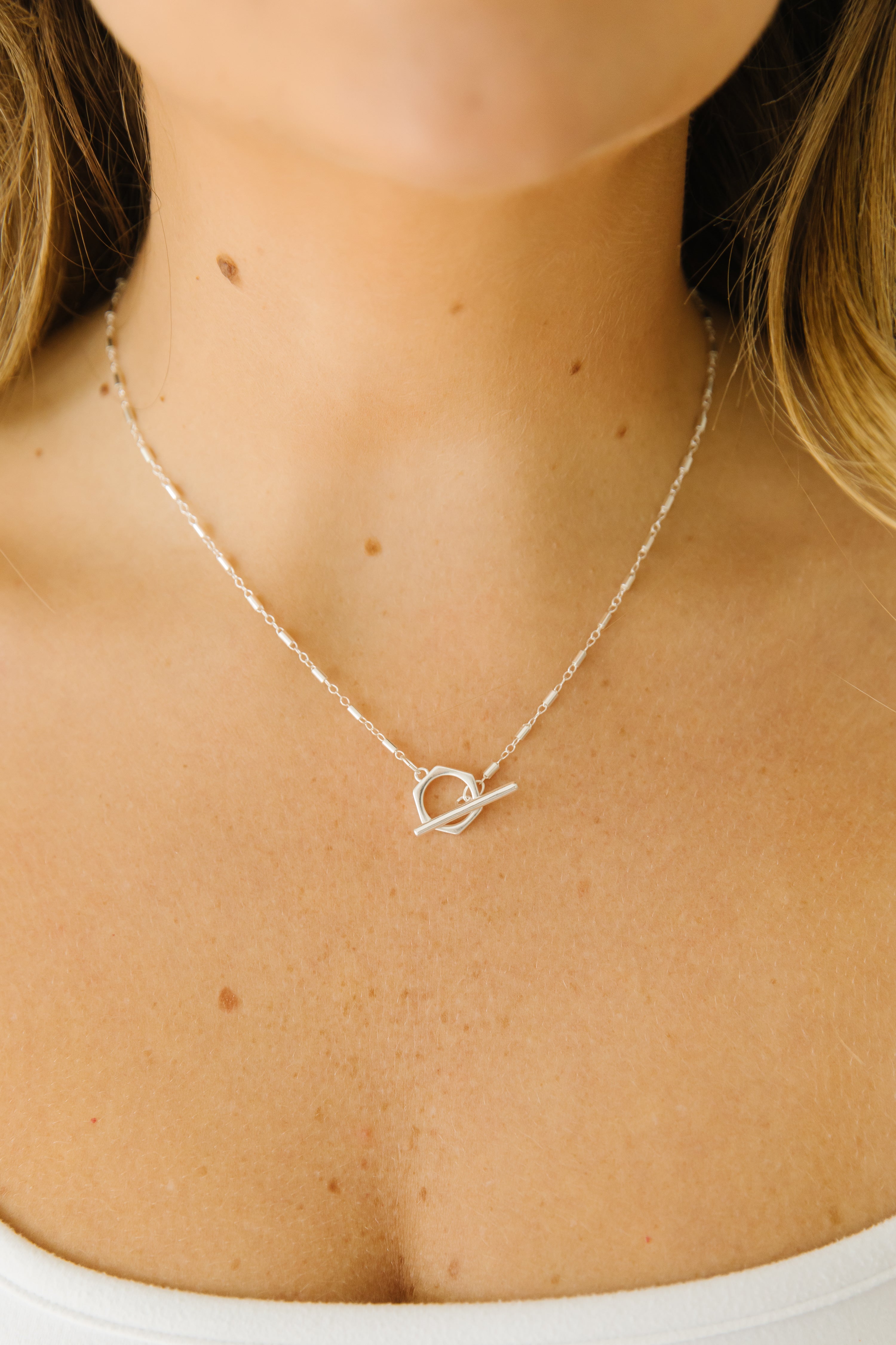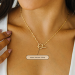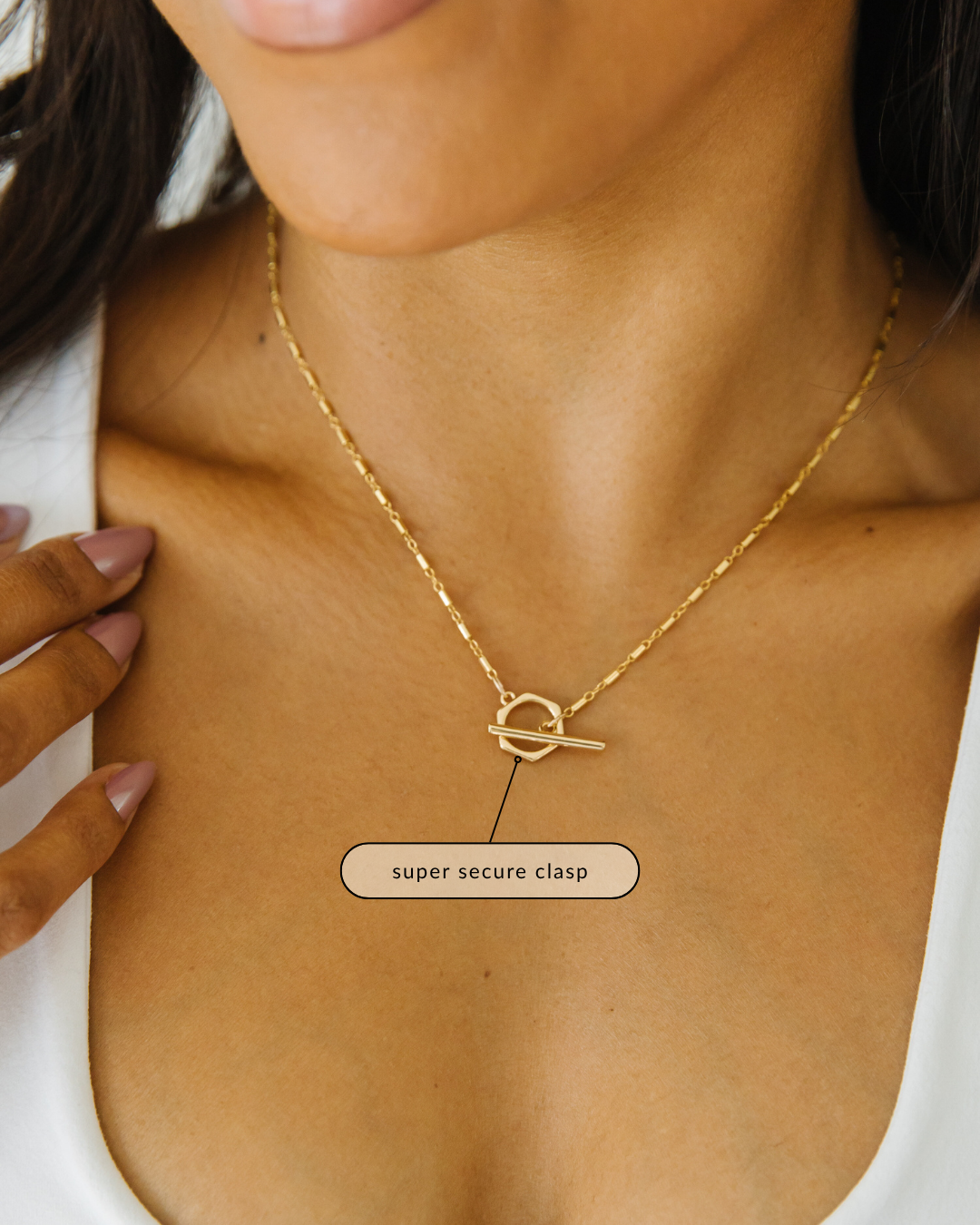 • This necklace has a front clasp that slips in and out.  At times the clasp may come loose. (Similar to a shoelace coming loose.)  For the majority of people, this is not a problem.  If you feel it come loose on your neck it is super simple to clasp back into place. As a hack you may loop the chain around twice into the hexagon toggle.  This serves as a type of “double knot” and will keep the necklace more secure.