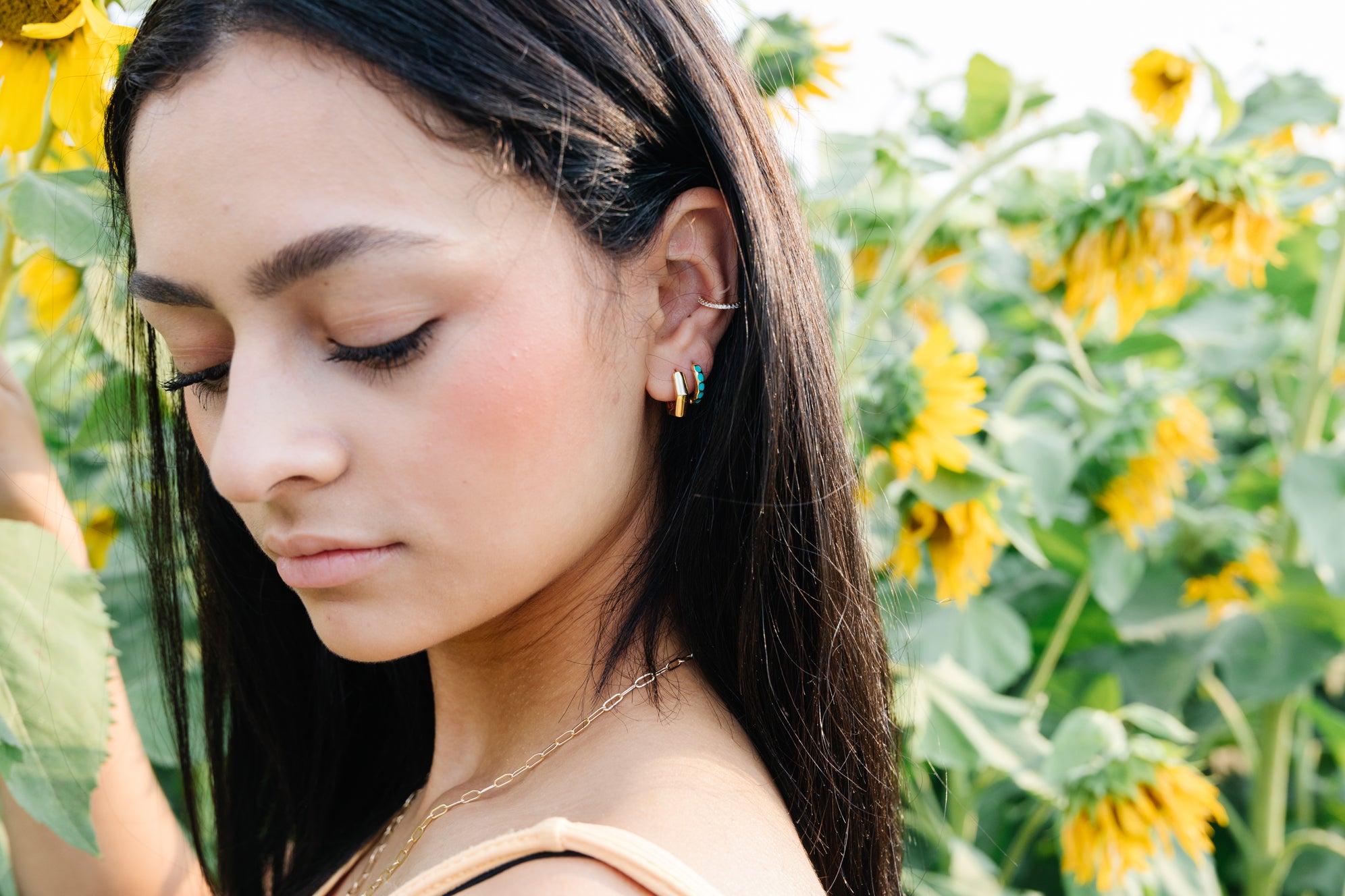 • Model is also wearing turquoise huggies and diamond ear cuff.