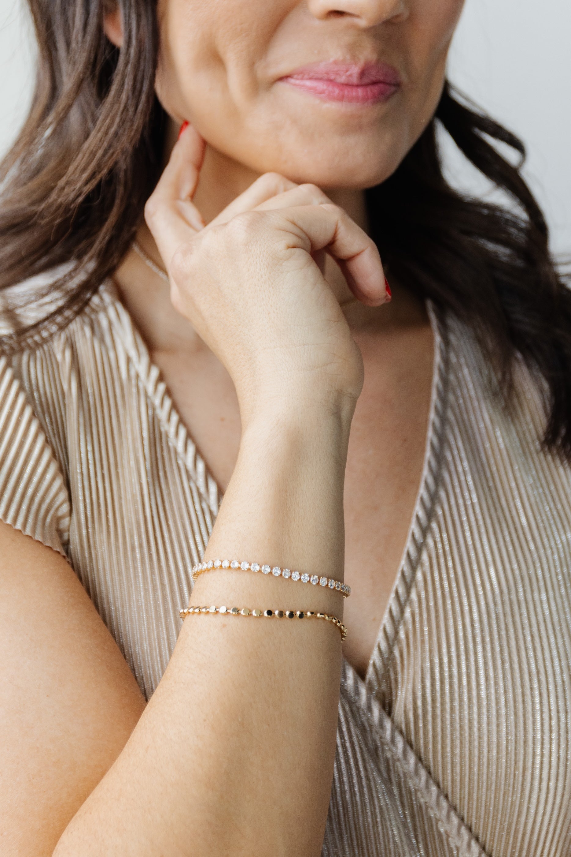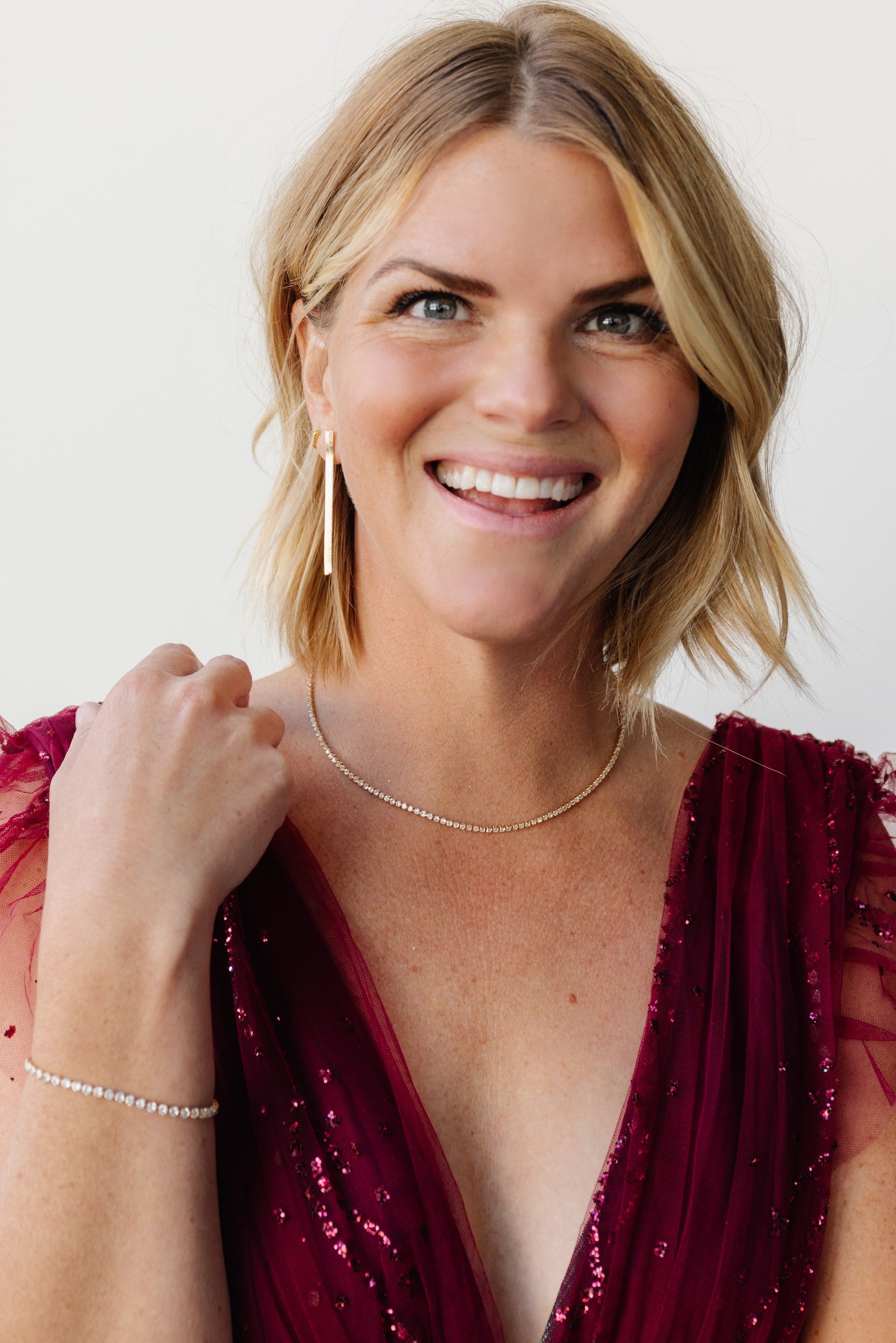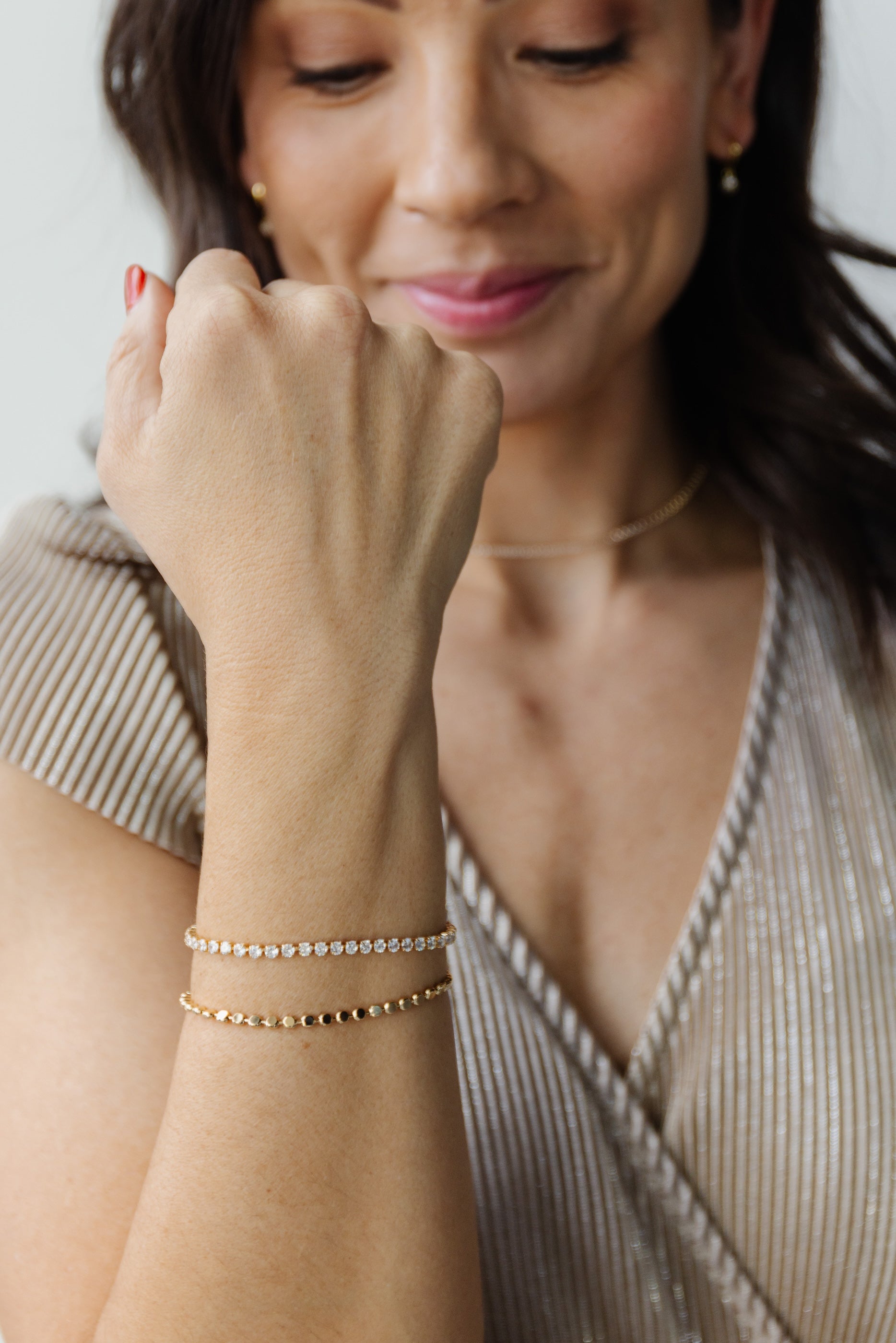 • Model is also wearing Monroe necklaceNYE huggies, and Raise a Toast bracelet.