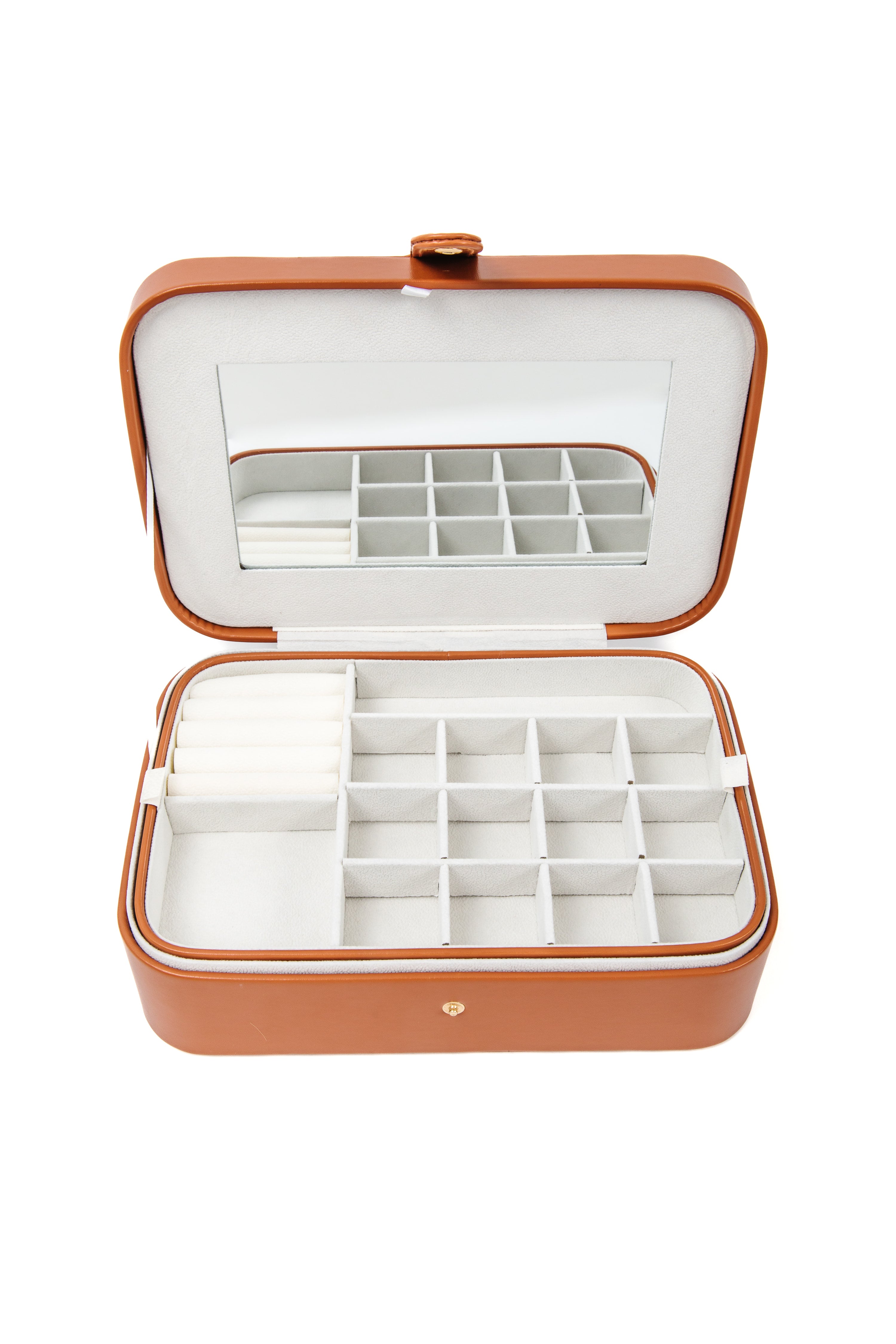 • Bottom level has nine 3 x 3 inch sections for bracelets, watches, and any large pieces that need a bit more space.